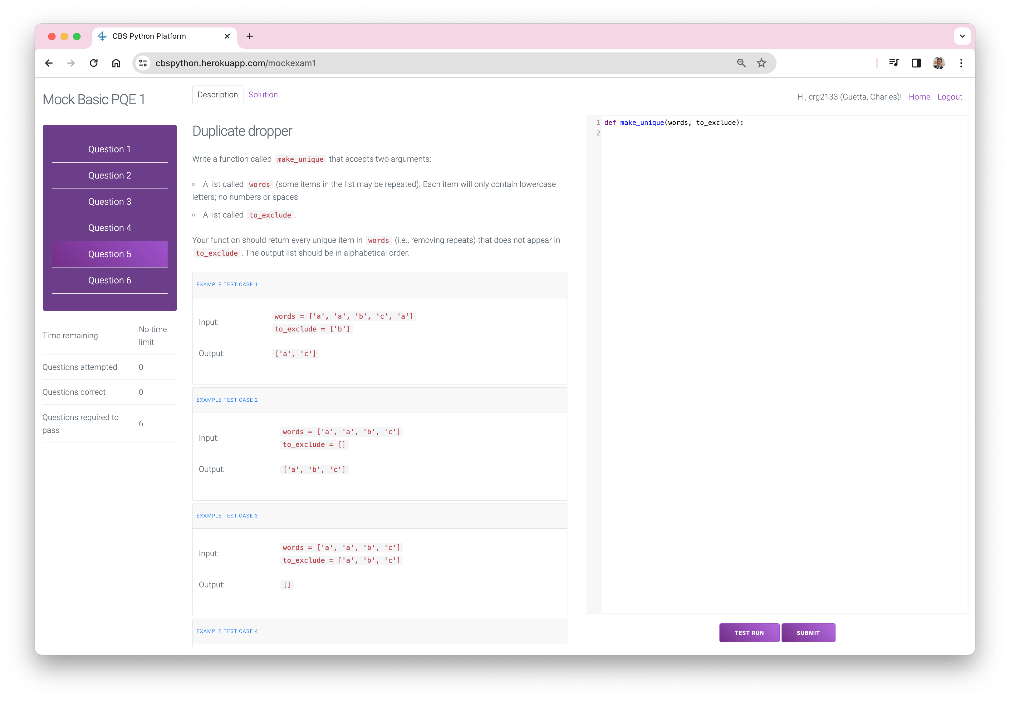 First, a not-for-credit Canvas class, comprising four hours fifteen minutes of videos I recorded to cover the basics of Python. This is provided in conjunction with a custom-designed platform - which we created from scratch - which students could use to practice the concepts in the videos. Here is a screenshot of the system